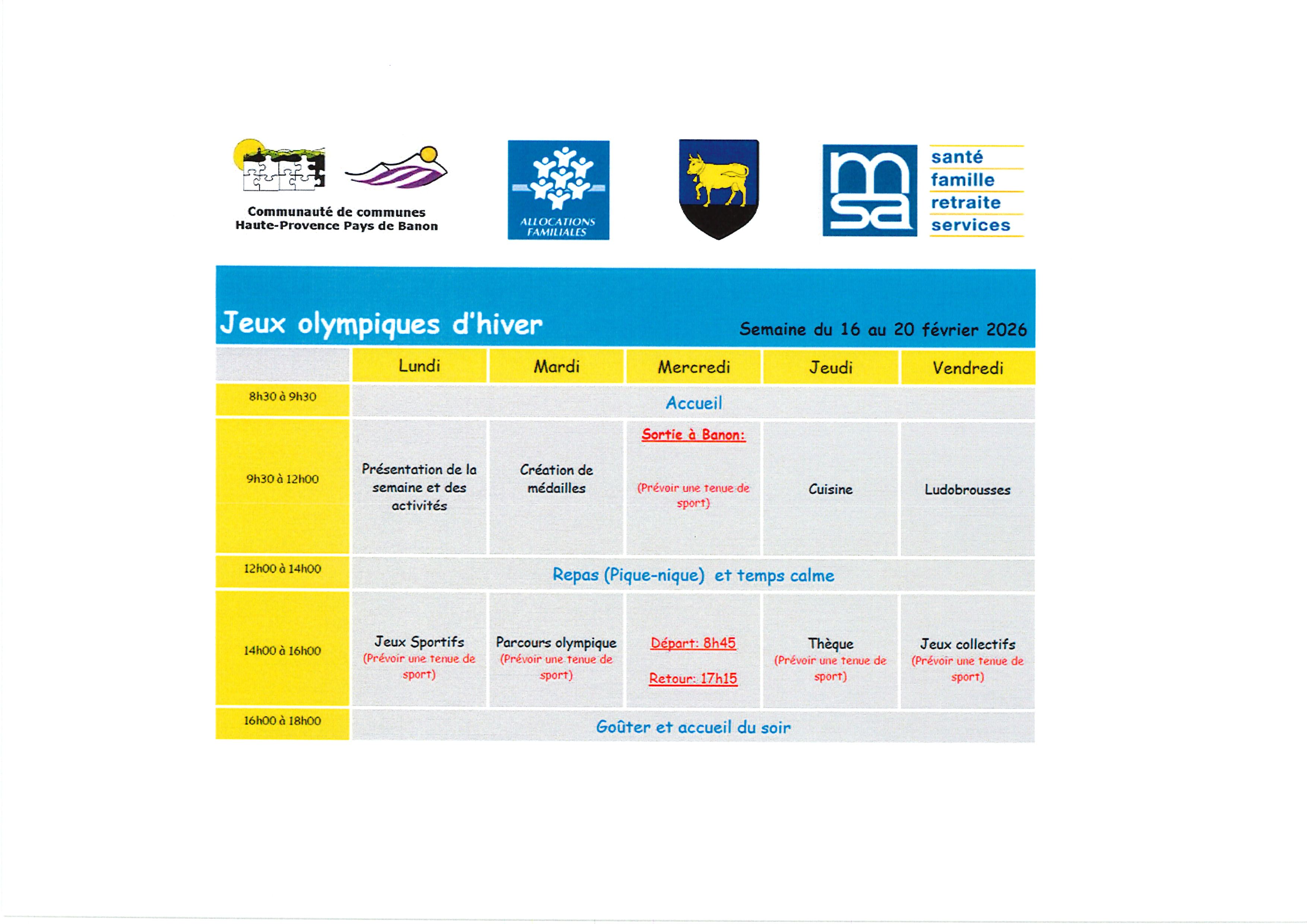 JEUX OLYMPIQUES D'HIVER - CENTRE DE LOISIRS PROGRAMME SEMAINE DU 16 AU 20 FEVRIER 2026